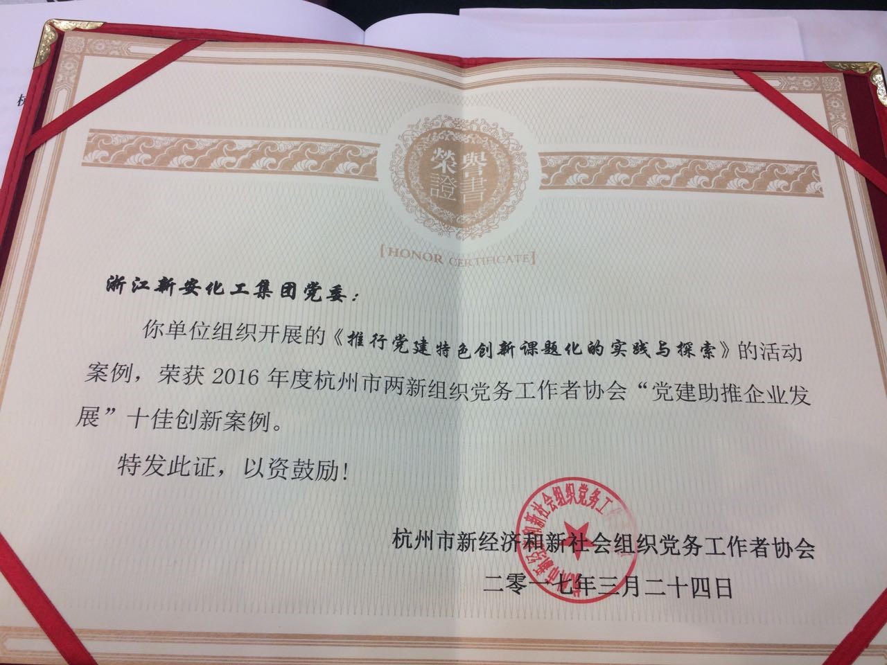 會議隆重表彰了2016年度各類先進(jìn)。集團(tuán)黨委書記潘秋友榮獲杭州市“兩新”協(xié)會優(yōu)秀會員,集團(tuán)黨委負(fù)責(zé)的杭州地區(qū)“兩市兩縣”第八片組榮獲優(yōu)秀集體,集團(tuán)黨委申報的“推進(jìn)黨建特色創(chuàng)新課題化的實踐和探索”榮獲“十佳創(chuàng)新案例”,并獲得優(yōu)秀通訊員等榮譽(yù)。