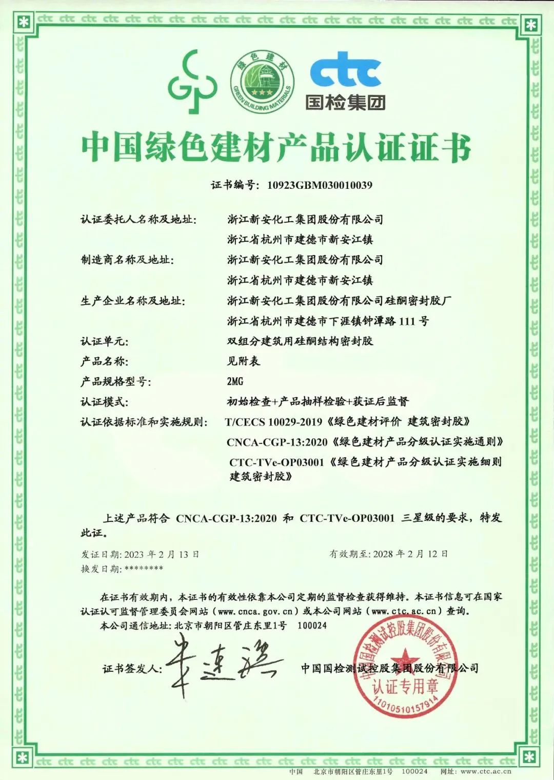 新安作為綠色化學(xué)的領(lǐng)創(chuàng)者,緊跟國家綠色低碳發(fā)展步伐,通過發(fā)揮硅基新材料產(chǎn)業(yè)鏈優(yōu)勢,積極探索綠色建筑密封解決方案,近期新安旗下8款建筑密封膠產(chǎn)品通過中國建材檢驗認(rèn)證集團股份有限公司(CTC國檢集團)的檢測,榮獲《中國綠色建材產(chǎn)品認(rèn)證證書》。